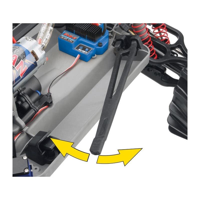 Traxxas Stability Management (TSM) allows you to experience all the extreme power, speed, and acceleration that was engineered into your E-Maxx Brushless making it much easier to control on common slippery surfaces such as a dusty track, loose dirt, and even ice and snow. Punch it off the line and TSM goes to work sensing the vehicle’s direction and making steering corrections to provide straight-ahead full-throttle acceleration without fishtailing, spinouts, and loss of control. TSM also works during cornering, first making intuitive corrections to maintain your line, and then allowing you to hammer the throttle earlier in the turn for much faster exit speeds. Braking is dramatically improved as TSM works to keep you arrow straight until you come to a complete stop.