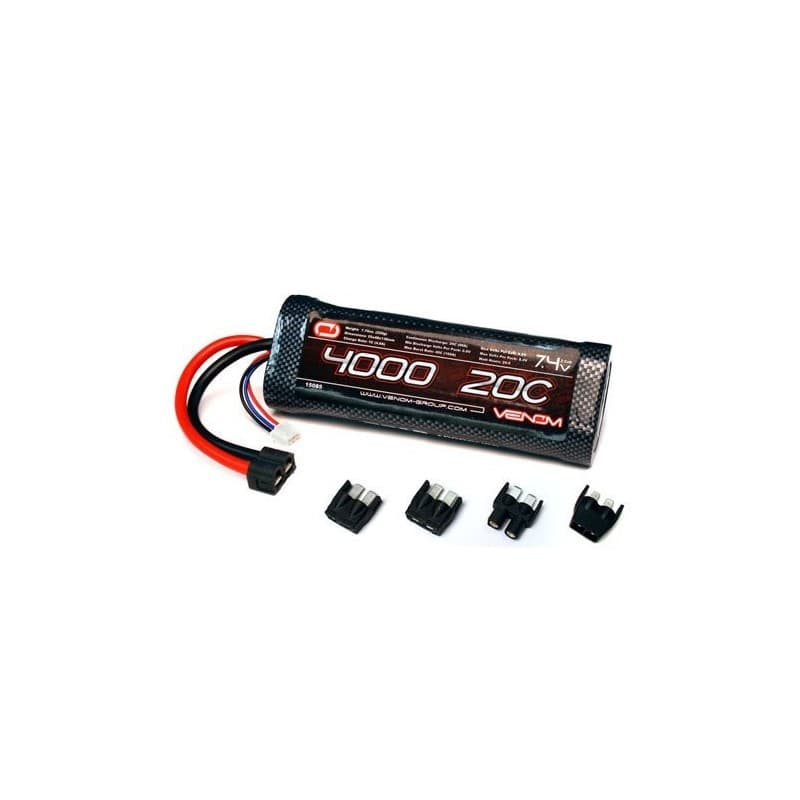 When you want a powerful battery pack that you can depend on even when you push it to its limits, this 20C 2S 4000mAh 7.4V LiPo Battery is for you. Whether you have a short course truck, an 8th scale buggy, a monster truck, heli, jet, airplane or quad, this battery pack delivers the results and run-time you have come to expect from all Venom batteries. With included plug adaptors that fit Deans, Traxxas, Tamiya and EC3 plug types as well as features like 12 AWG soft silicone wire leads and Venom patented High Current Universal Plug System (patent no. 8,491,341) this battery gives you the power you are looking for.