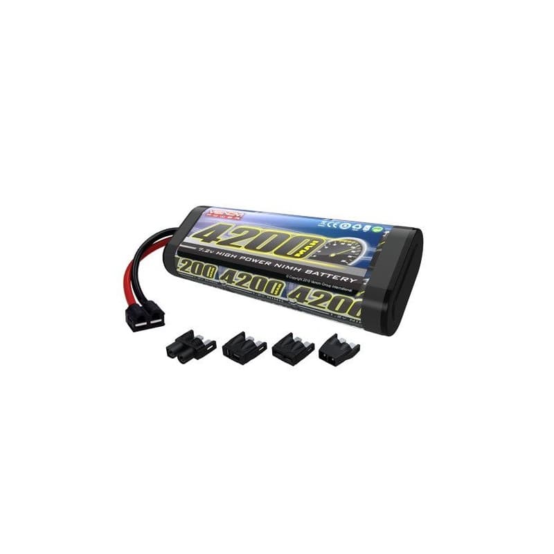 Trust the battery that consistently delivers peak performances even through the roughest conditions. The Venom 7.2V 4200mAh NiMH battery pack has a high-capacity, high-discharge rate that gives you the power and run-time you expect from all Venom batteries. This battery includes not only plug adaptors to fit Deans, Traxxas, Tamiya and EC3 plug types, but also heavy-duty features like 12 AWG soft silicone wire leads and Venom patented High Current Universal Plug System (patent no. 8,491,341). Whether you have a remote-controlled heli, jet, airplane, quad, buggy or truck, this is a battery pack you can depend on.
