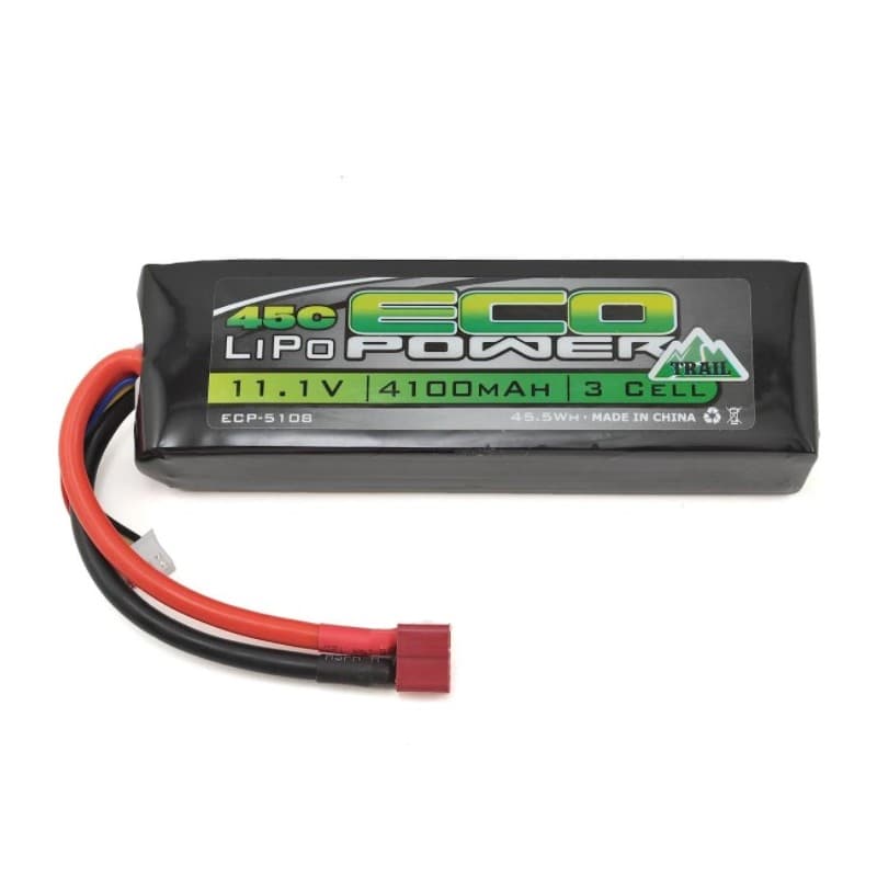 The EcoPower "Trail" 3S 4100mAh LiPo battery combines 45C discharge rates and 43x141.5x26.5mm dimensions to create a powerful battery that is perfect for high power crawler applications. This pack is a great choice for 1.9 and 2.2 class trucks running brushed ESC/Motor combos, as well as brushless rigs and heavy scale applications. This pack has a T-Style Ultra connector pre-installed, and comes with a 4-pin Align/E-Flite style balance connector.