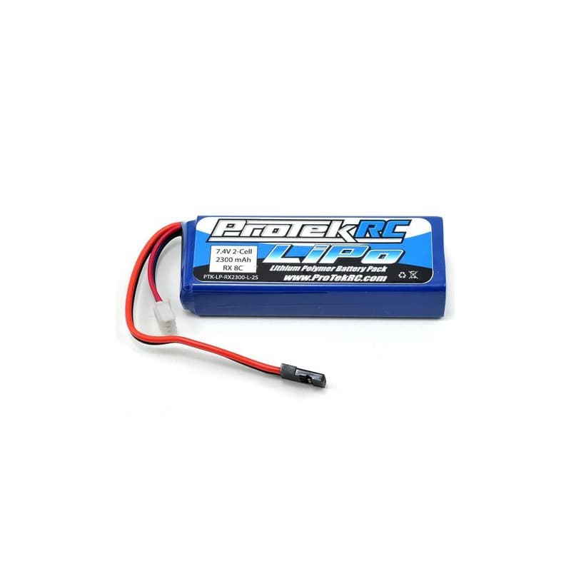 This is a Li-Poly 2300mAh receiver battery pack from ProTek R/C, made with super thick 20awg silicone wire! This super light weight Li-Poly battery is designed to power the electronics of 1/10th & 1/8th scale nitro powered race cars. There are many advantages to using a Li-Poly receiver battery, but the biggest advantage is that the battery voltage to your receiver and servos will remain constant throughout the race with the use of a voltage regulator (required). A constant voltage level to your servos will ensure consistent performance at the start and end of your race compared to typical NiMH receiver battery packs. Additionally, the overall weight of your race car will be significantly reduced over the use of typical NiMh receiver packs.