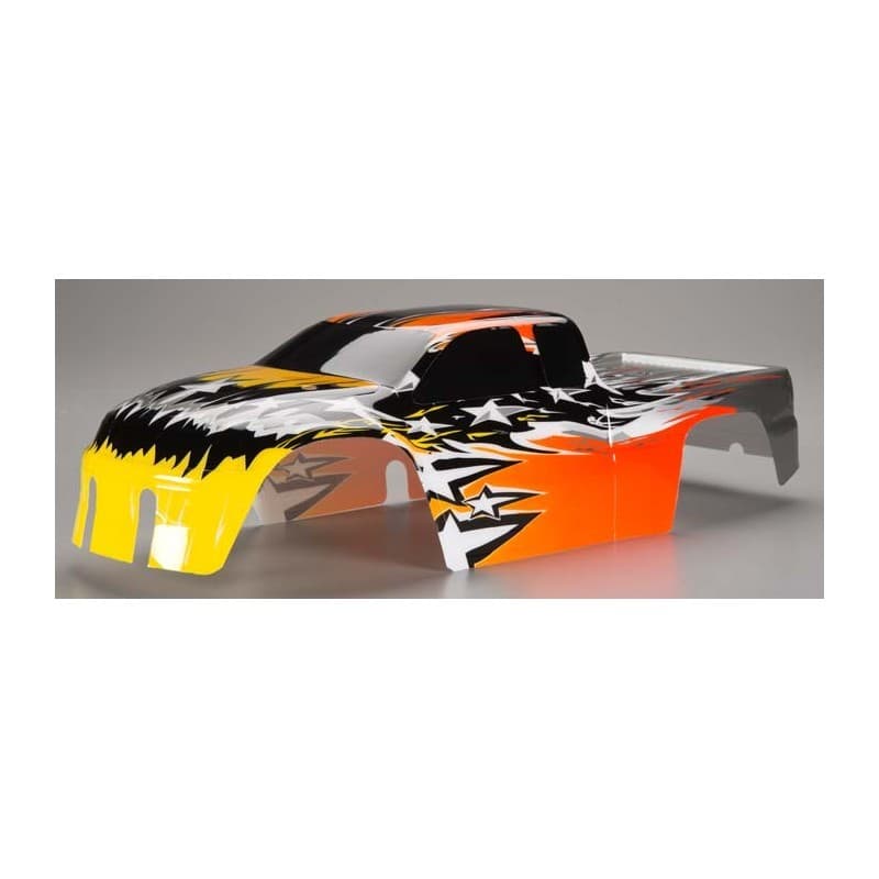 This is the Disruptor Body from Traxxas to fit the T-Maxx vehicle. The detailed design uses metallic silver, along with yellow, red, and white, over jet black. For use on both the SportMAXX and T-Maxx vehicles.