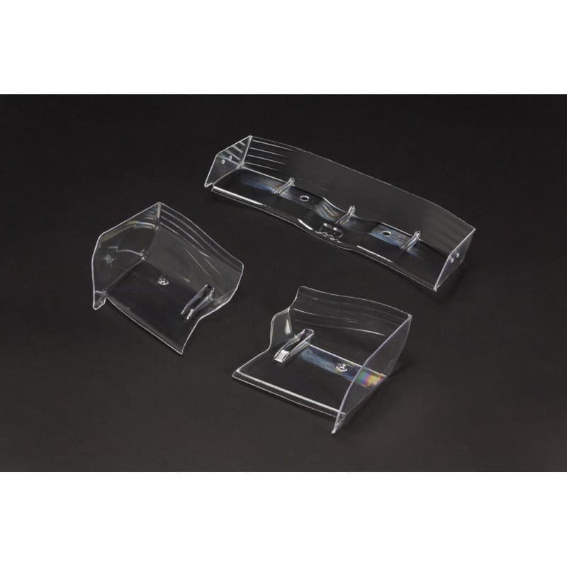Includes rear wing and left and right front wing elements - Provided clear to allow you to customize the look of your vehicle - Precisely machined mounting holes for fast and easy fit to your model - Strong and durable polycarbonate material - Molded in cut lines for fine aero balance adjustment