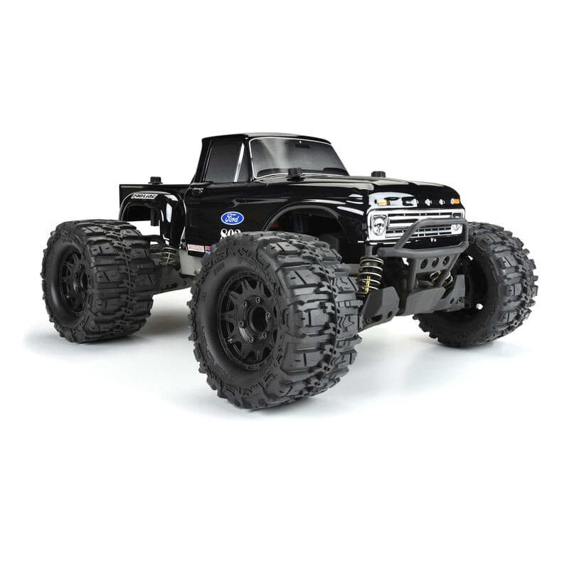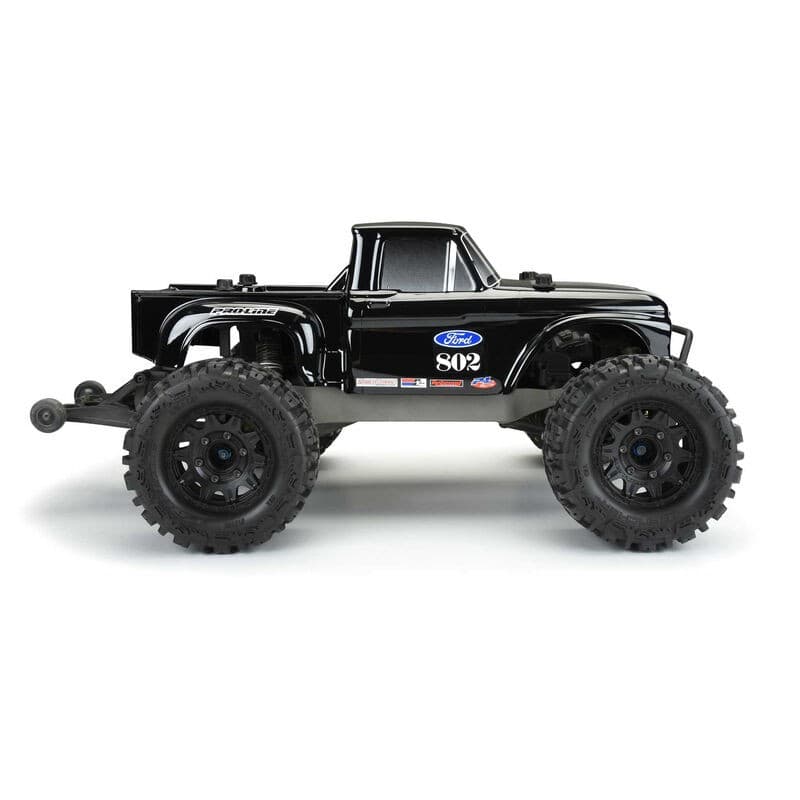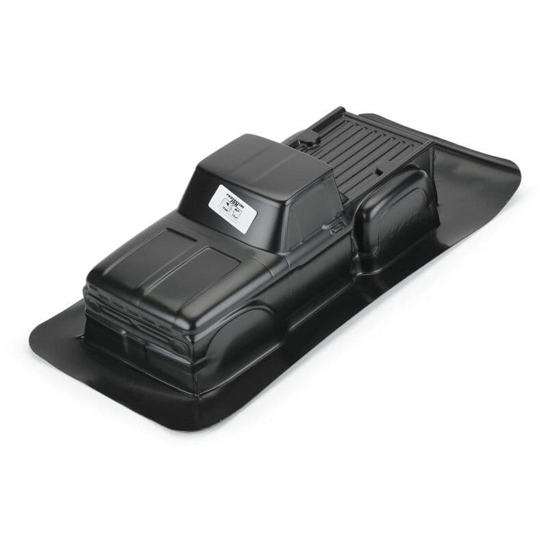 This is a 1966 Ford® F-100 Tough-Color (Black) Stampede® Body. Now you can have your very own black "Hay Hauler" with Pro-Line's licensed 1966 Ford® F-100 body made from completely black Tough-Color polycarbonate material! The '66 F-100 body comes with perfectly scaled details like the step-sides and huge fender flares that will bring you back to the good old days. The Tough-Color polycarbonate is made from black material, so you never have to worry about paint peeling or chipping off. Realistic window stickers are also included! This '66 Ford® body will turn heads and transform your truck into the best-looking truck around. Get your very own "Hay Hauler" body now!