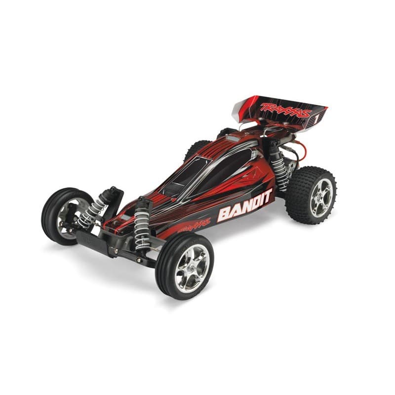 The RTR( ready to run) Traxxas Bandit takes RC fun to a whole new level with faster speeds, innovative technology, hobby-grade durability, and low price. On-road or off-road, the Bandit’s sleek chassis keeps weight down low for razor-sharp handling and blazing speed. The powerful Titan® 12-Turn modified motor and high-current XL-5® Electronic Speed Control deliver lightning-fast acceleration and incredible 35+mph* performance. Pull the trigger and Bandit rips massive rooster tails, soars over jumps, and lays down the power for serious excitement at every turn. Traxxas' exclusive waterproof electronics make even the wildest all-weather adventures possible. Step up to genuine Traxxas quality and performance and discover a whole new level of fun with the Traxxas Bandit!
