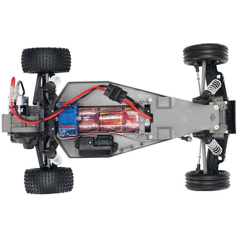The Traxxas Bandit™ redefines traditional buggy performance by creating a whole new class of Extreme Sports Buggy™. Bandit offers the highest levels of speed, action, and fun that will easily make it one of your favorites for all kinds of R/C driving excitement. The lightweight Bandit chassis is loaded with an aggressive Titan® 12-Turn modified motor and a high-current XL-5 Electronic Speed Control that deliver lightning-fast acceleration and incredible 35+mph* performance. Pull the trigger and Bandit rips massive rooster tails, soars over giant jumps, and lays down the power for pure performance and excitement at every turn. Bandit is infused with the latest tech including the patent-pending Revo®-Spec Torque-Control™ slipper clutch and Alias™ high-performance 2.2" racing tires. The advanced dual-pin rear, and ribbed front tread designs are engineered to work with our exclusive rubber compounds for superior off-road traction and directional control. The industry standard 2.2" mirror-chrome Tracer™ wheels open the door to a wide range of tire options, including the optional Traxxas Anaconda 2.2" street treads.