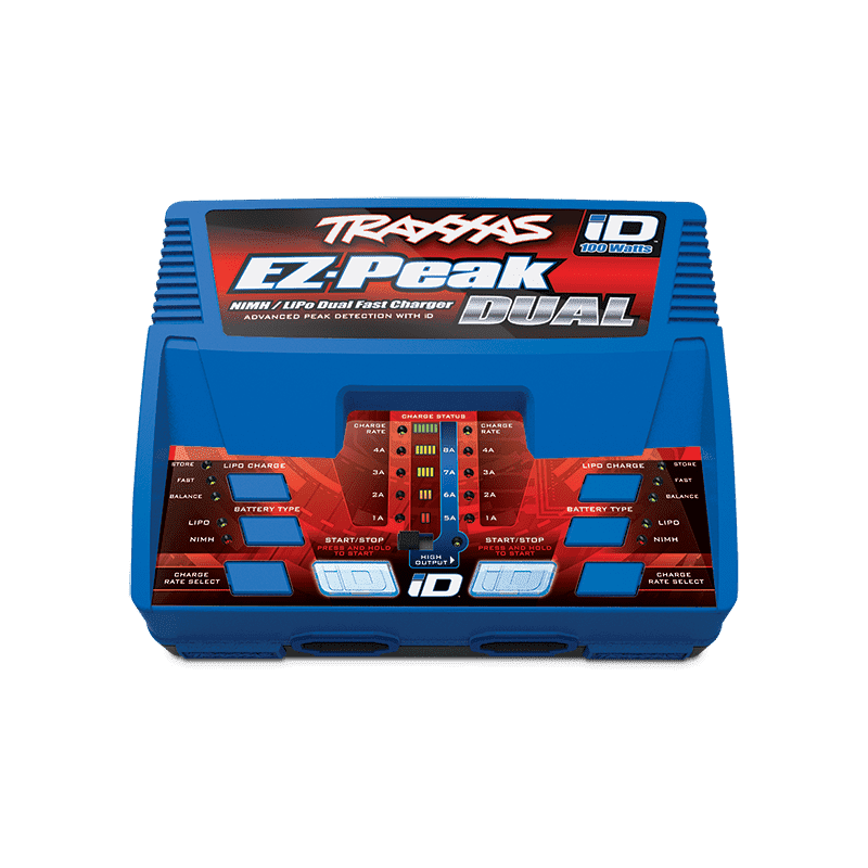 Simple. Fast. Just plug in a pair of Traxxas iD batteries and press Start. Traxxas’ exclusive iD technology eliminates complicated charger programming by automatically configuring and optimizing the charge settings for Traxxas iD batteries. The EZ-Peak Dual charges two batteries simultaneously at up to 50 watts (4-amps) each, or switch to High-Output mode to charge a single battery at the maximum 100 watt (8-amps) output. Charging faster means more fun time behind the wheel. You can even charge a NiMH and a LiPo at the same time! The progress bar and audible alerts keep you informed while the advanced high resolution peak detection delivers a perfect charge every time. The EZ-Peak Dual’s Storage Mode protects your LiPo battery investment by safely preparing the batteries for extended storage.