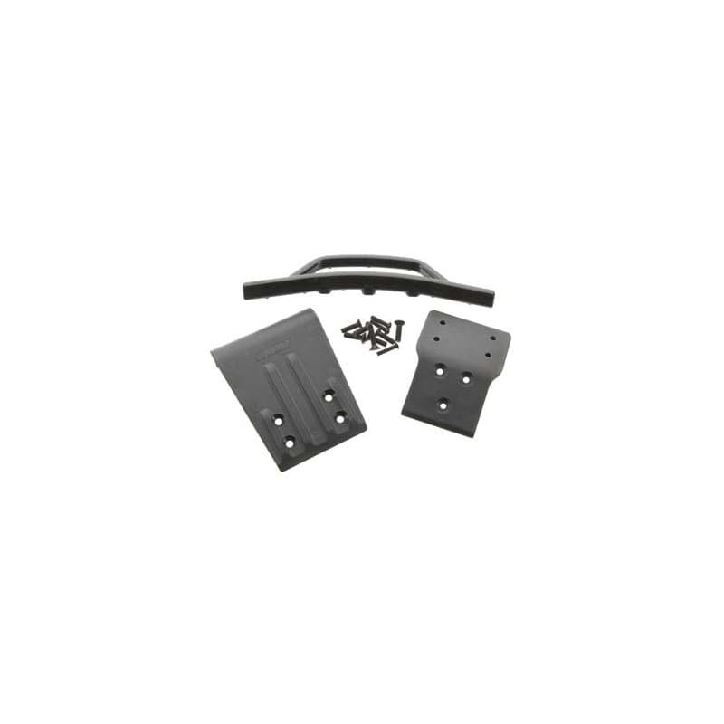 Traxxas Slash 4×4 front bumper design eliminates the bumper support ring and the 4 screws behind the stock bumper while using a thicker skid design to supply the cushioning resistance a basher-proof bumper needs. By eliminating the stock bumper support ring, absolutely no frontal impact crash energy is transferred into the upper half of the differential housing. RPM supplies longer bumper mounting screws as well, so any impact energy from down low has less of a tendency to pull the mounting screws out from the bottom half of the differential housing. With an RPM impact-absorbing front bumper installed, the energy transferred from frontal impacts will be greatly reduced as well.