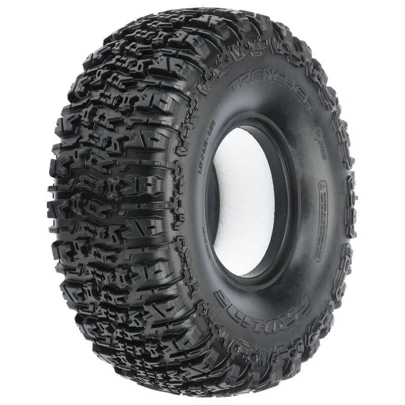 This is a pair of Trencher 1.9" Rock Crawling Tires. The almighty Hyrax finally has some real competition with Pro-Line's all-new 1.9" (4.75" Tall x 1.81" Wide) Trencher Tire! Inspired by Pro-Line's insanely popular all-terrain Trencher tread, this Class 1 legal crawler tire is ready for anything your Scale Adventure might throw at you. The Trencher 1.9" features an extremely aggressive tread pattern with each tread block containing multiple sipes and multiple levels for incredible tread flex while still looking great on a Scale Rig. The highly detailed connected tread on the sidewall of the Trencher extends out for great side-hilling performance that only slides out when you want it to! The Trencher 1.9" tire is made from Pro-Line's Legendary G8 material and Super Soft Predator Compound, so you know it provides the performance you can depend on. The future of 1.9" tire performance is here with Pro-Line's new Class 1 Trencher tires! Get your own set of Trenchers today!