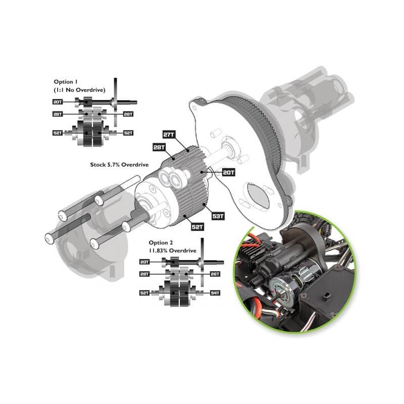 At the heart of the Enduro is our revolutionary Stealth(R) X gearbox. Although the exterior appears to have a conventional 3-gear transmission look, the inside is far from conventional. The Stealth(R) X features the ability to adjust the rear drive ratio independently from the front drive across three levels: stock overdrives the front end 5.7% (installed in RTR), option 1 provides a one-to-one drive ratio front-to-rear (available separately), and option 2 overdrives the front end 11.83% (included with RTR).