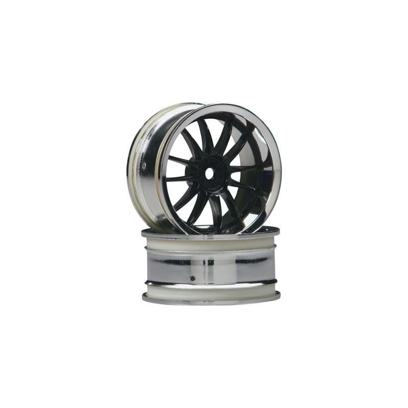 This is a pair of HPI Work XSA 02C 26mm Chrome and Black Wheels with 3mm Offset.