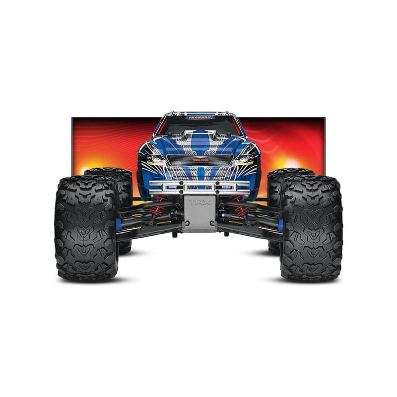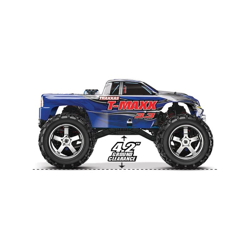 The T-Maxx 3.3 is the biggest Maxx ever. Giant Maxx tires deliver massive grip off-road and at 6.3" tall, they add increased ground clearance to gobble up deep ruts and overcome huge boulders. In the city, urban obstacles such as curbs and stairs beckon for an all-out Maxx assault. Maxx tires come pre-glued to 3.8" Mirror-Chrome Hurricane wheels. Traxxas engineers equipped the T-Maxx 3.3 with an extended wheelbase (30 mm longer) for maximum stability. T-Maxx is able to put more power the ground for even more acceleration and amazing directional control. There's no skimping when it comes to the chassis. It's formed from 4 mm thick 6061-T6 aluminum and then anodized in brilliant blue. Meaty chassis braces and a rugged skid plate add rock-solid rigidity.