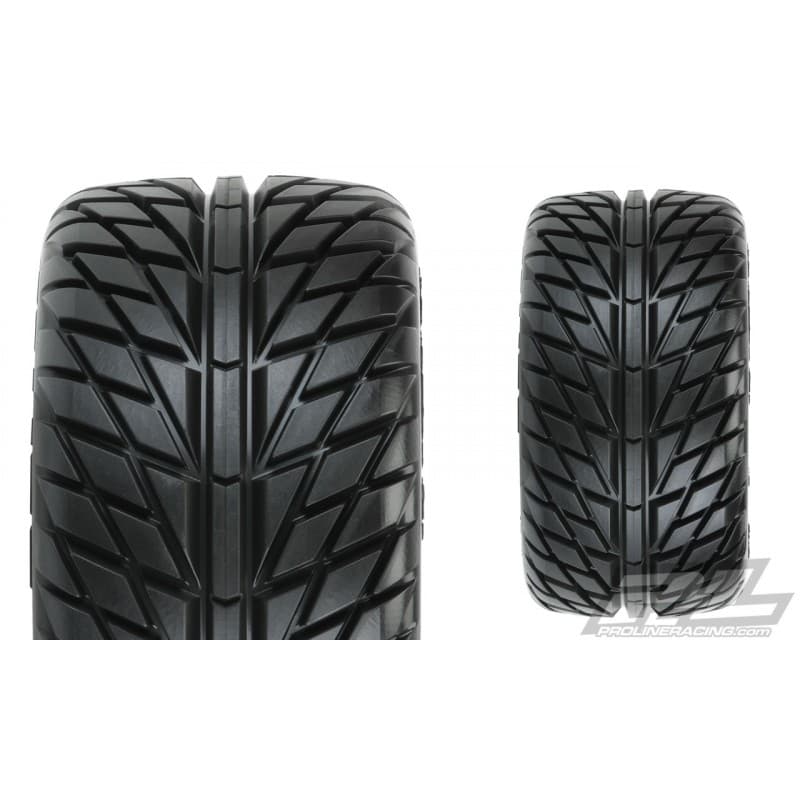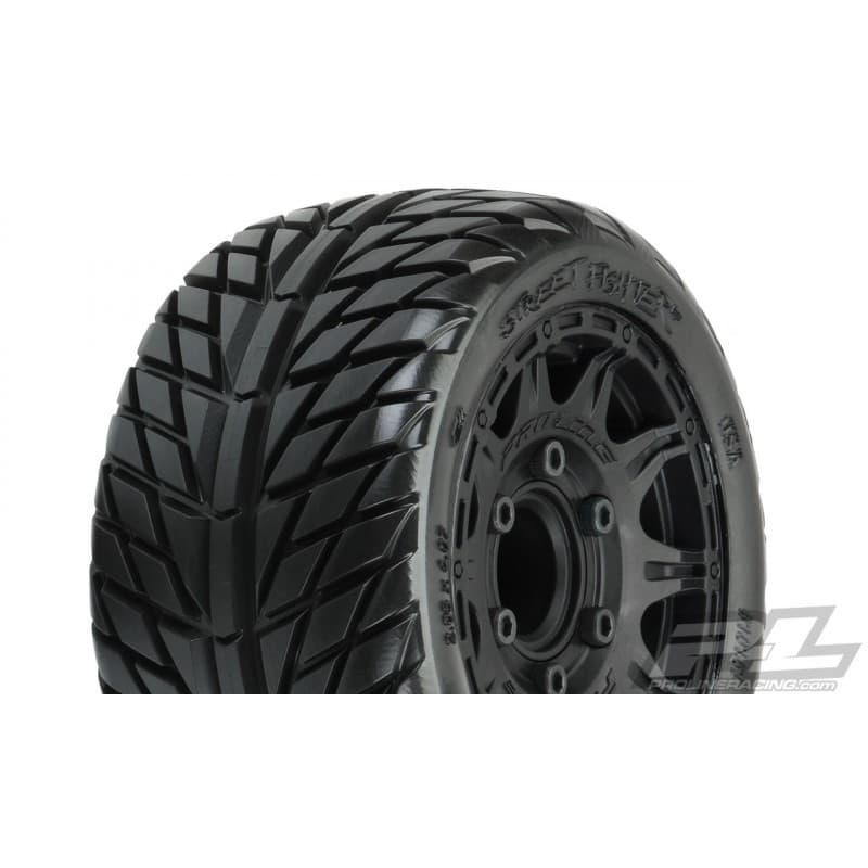 This is a pair of pre-mounted Pro-Line Street Fighter LP 2.8" Tires. Looking for the ultimate street tire? Then check out Pro-Line's Street Fighter LP (Low Profile) 2.8" Tire perfect for your Rustler® 2wd or Rustler® 4x4! Based on the latest in high performance on-road tire technology, the Street Fighter LP 2.8" tire has the perfect balance of G force enhancement and style that will keep your truck turning heads!