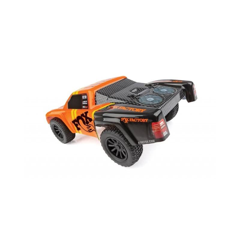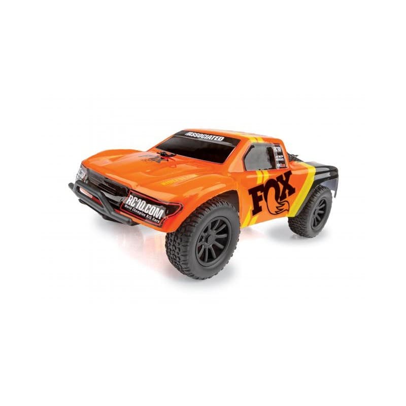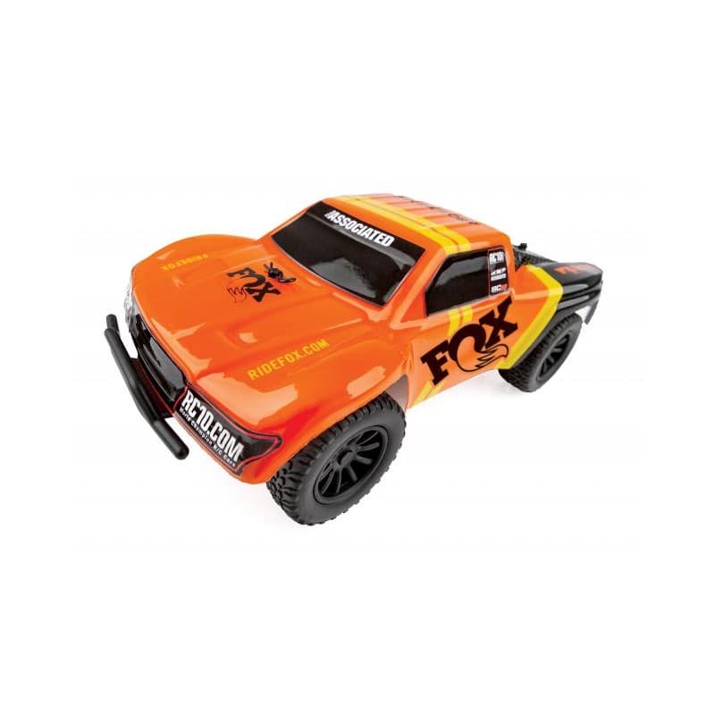 Team Associated is pleased to announce a new licensed version of the FOX SC28 short course body, featuring an orange paint scheme with the iconic FOX logo. The included 2.4GHz transmitter allows complete control, enabling you to navigate around, through, and over obstacles with ease! After the vehicle's integrated battery becomes discharged, the convenient built-in transmitter charger makes it easy to get back to full power and ready to run in less than an hour. A built-in rechargeable battery and 4 AA's are included, so it is ready to go right out of the box! Just charge and drive!