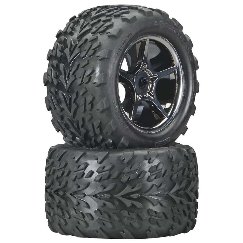 These are the Talon Tires mounted on Gemini Black Chrome Wheels for use on the Traxxas Maxx and Revo Vehicles. Use with 17mm Splined Wheel Hubs and Nuts, TRAC6333.