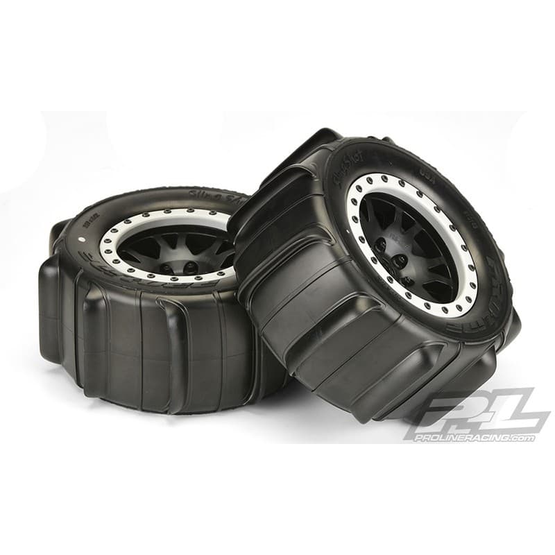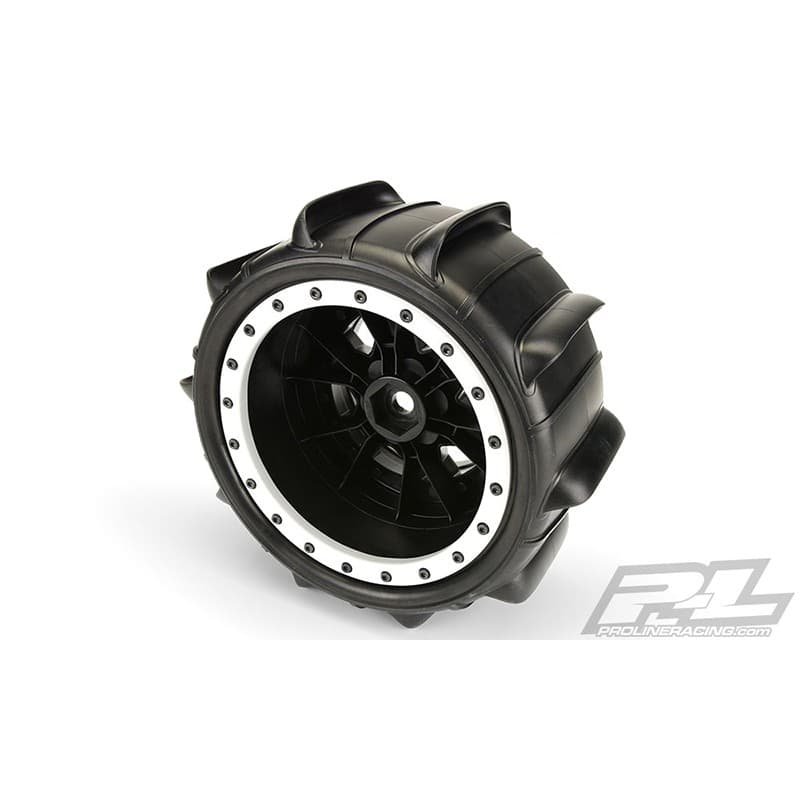 This is a pair of pre-mounted Sling Shot Paddle tires for X-MAXX®. Pro-Line is ready to unleash the Sling Shot paddle tire for X-MAXX® owners! Pro-Line Sling Shot tires are known for having an incredible scale paddle tire appearance combined with unbelievable Sand and Snow performance! These tires have been developed from the ground up for extreme X-MAXX® punishment with an all-new ultra-durable compound that prevents tire ballooning even at high speeds. The Sling Shot 4.3" tire features Pro-Line's groundbreaking proprietary Pro-Loc Technology that creates an ultra-secure bond to Pro-Line's Impulse Pro-Loc X-MAXX® wheels while still being removable when required. The reinforced Tire bead fits into a uniquely shaped channel on the wheel and the bead-loc screws actually pass through the tire rubber before being pinched by the outer bead-loc ring to create the maximum possible mounting security. This technology debuted on the Badlands MX43 Pro-Loc Tires and has proven to be extremely popular for the X-MAXX® fans.