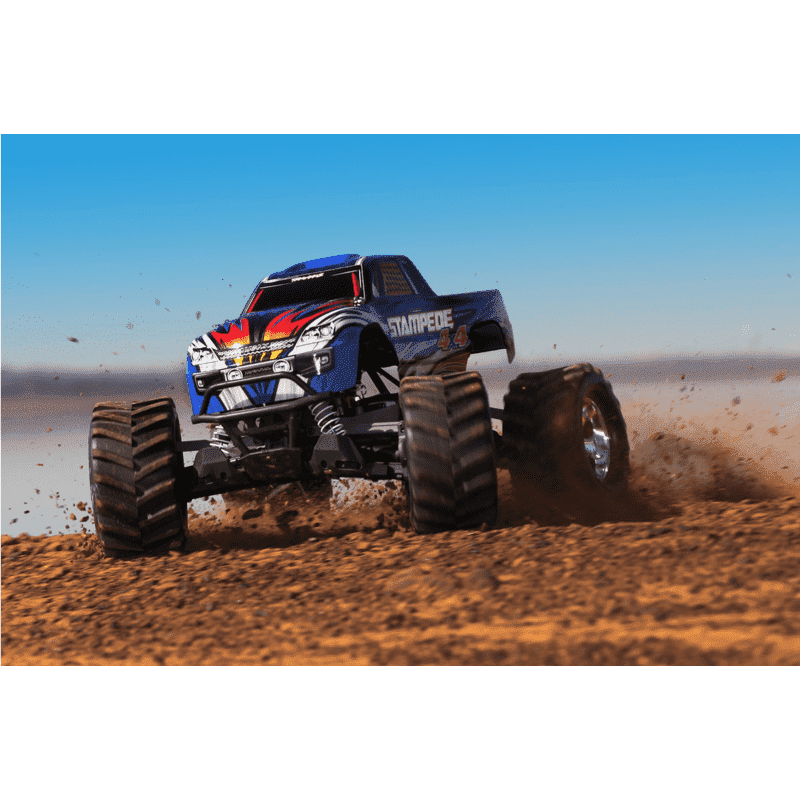 Stampede 4X4 is built on the proven performance of the advanced shaft-driven 4WD system and innovative modular design of the award-winning Slash 4X4. The chassis fully integrates the electronics and battery compartment for an efficient and compact layout, and maintains the high center ground clearance that gives Stampede its monster stance and high-riding look. The extra clearance drastically increases the off-road versatility that allows you to tackle rougher terrain and bigger obstacles. The Stampede 4X4 feels planted and secure at speed, even on pavement and in other high-grip conditions. Stampede 4X4 is 100% monster truck, but it handles like a racing machine!