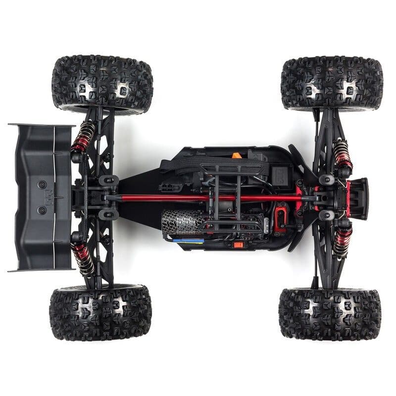 ARRMA® holds your maintenance downtime to the minimum with an efficient, driver-friendly design. A sliding mount allows quick, hassle-free motor access. The center diff is easy to reach and can be removed by taking out just seven bolts. Topping it all off is a monster truck body with streamlined good looks, featuring a red/black or blue/black trim and ultra-detailed decals.