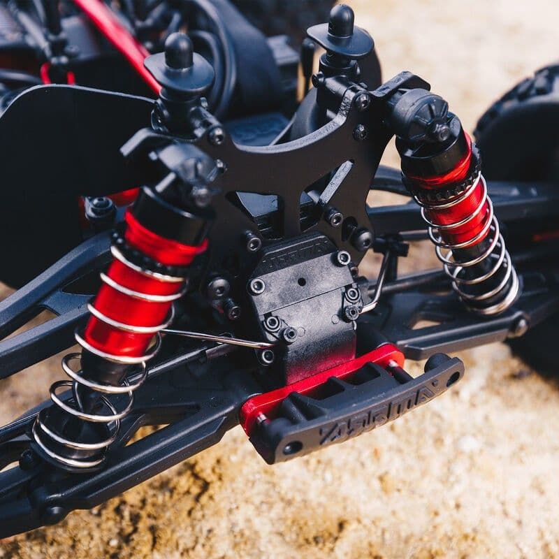 For the durability needed to support intense brushless performance, ARRMA® uses a strong anodized aluminum chassis as the foundation. A center body support and new aluminum center brace plus composite chassis side pods add more strength. All-metal diff outdrives and gearbox internals plus durable steel driveshafts provide a reliable, heavy-duty drivetrain that holds up to extreme, high-speed bashing. A new "never loose" aluminum steering servo saver and "never pop" ball ends supply more precision, reliability and confidence.