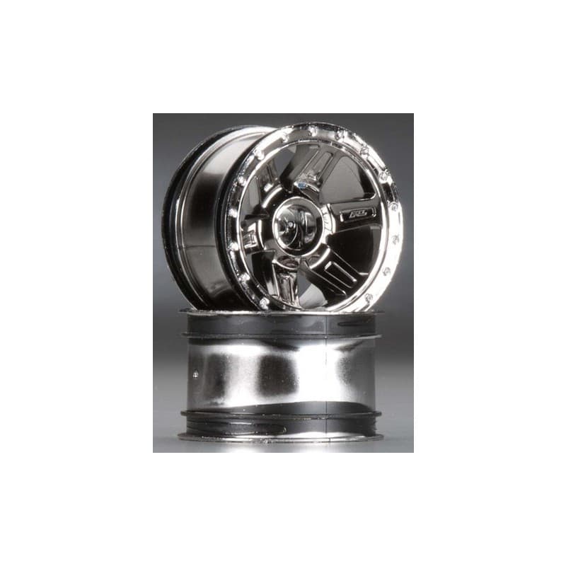 This is a pair of Desperado 2.2” Black Chrome Wheels for 1:16 E-REVO. Pro-Line is proud to introduce a new lightweight wheel specifically designed for the extremely popular 1:16 E-REVO! The wheel features a wider offset, just like Pro-Line’s immensely popular Bead-Loc wheels, that will make your truck more stable and handle bumps and jumps like a champion. Pro-Line’s highly anticipated new 6-spoke Desperado wheel will make your truck the toughest looking one on the block. Pro-Line has combined high strength nylon with super stealthy Black Chrome finish to give you the ultimate in wheel selection and style. The wheel is a one-piece glue and features a molded in bead-loc ring for an awesome scale look. This 12mm hex wheel will accept all Pro-Line 2.2” buggy rear tires giving you a ton of rubber options to tackle any terrain. Make your truck stand out from the rest and get some Pro-Line Desperado 2.2” Black Chrome wheels today!