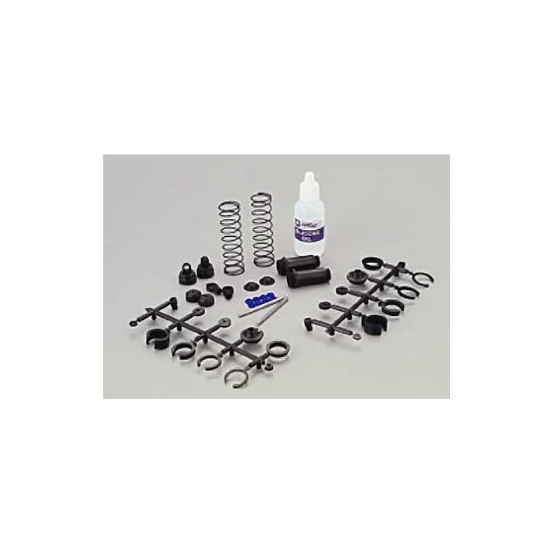 This is a pair of replacement front shocks for the Traxxas Stampede and Rustler trucks. The shock bodies are made of black plastic and there are four spring pre-load spacers (to vary the spring tension) for each shock.