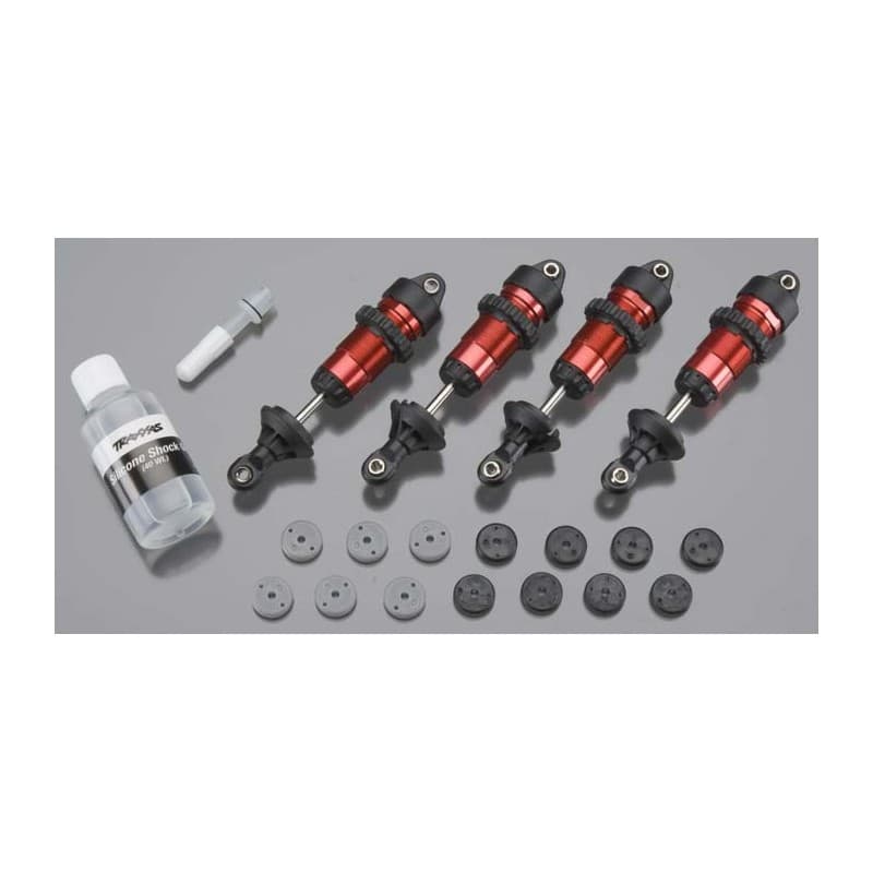 This is a set of four optional Traxxas Aluminum Body GTR Shocks in Red.