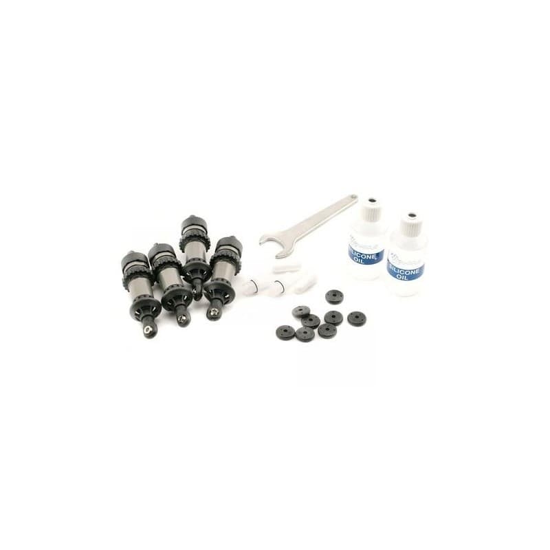 This is a set of Hard Anodized Teflon Coated GTR Shocks for the Traxxas Revo. The Traxxas Revo’s GTR shocks can be upgraded for smoother, longer lasting performance with this fully assembled shock set. The hard-anodized, Teflon®-coated aluminum bodies provide the smoothest finish possible that’s extra tough for long wear. Titanium Nitride (TiN) coating on the shafts provides an incredibly smooth and durable finish. These shocks feature the same threaded shock bodies and spring pre-load adjusters, volume compensating rubber diaphragms, and low-friction X-ring seals as standard GTR shocks. The kit includes 4 fully assembled shocks without springs.