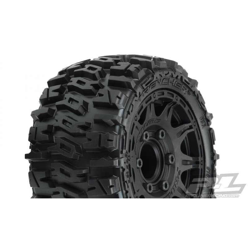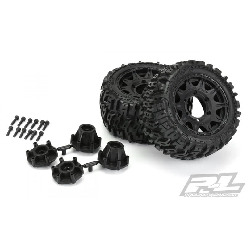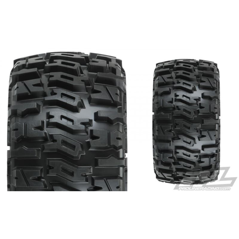 The Trencher LP 2.8" now comes conveniently Pre-Mounted on the next generation 2.8" wheel design from Pro-Line, the Raid 2.8" Removable Hex Wheel! Imagine being able to easily change the offset of your wheel to fit different applications by simply changing out the hex! You can go from the included 12mm narrow offset (2wd Stampede®/Rustler® Rear) to the included 12mm wide offset hexes (2wd Stampede/Rustler® Front and 4x4 Stampede®/Rustler® Front and Rear) quickly and easily. Also imagine being able to replace a damaged wheel hex without needing to replace your glued tires (6335-00 Replacement Hexes) or even upgrading your wheels to 17mm wheel hexes (6336-00 Sold Separately) for extreme use! These new Raid 2.8" wheels accomplish all of this and more by using Pro-Line's unique 6x30 interlocking hex design that is secured to the wheel by 6 M3 screws that are spaced 30mm across. The built-in adjustability and ease of use make this a new must-have wheel for bashers everywhere!