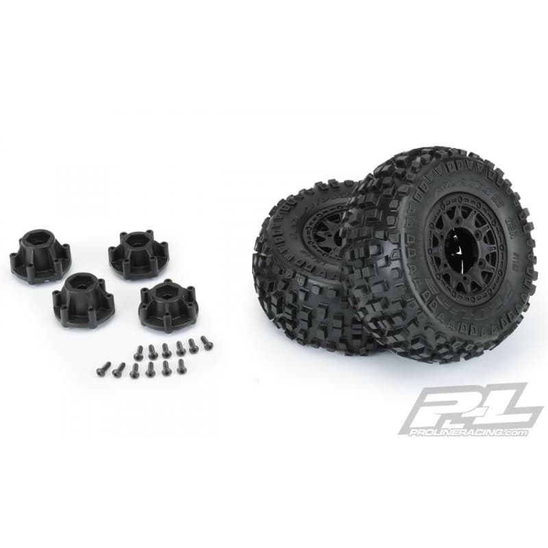 The Badlands SC tires are mounted to a pair of Raid SC Removable Hex Wheels. We take the guesswork out of your glue job by doing the mounting for you so you can spend your time having fun! Pro-Line is proud to introduce a true next-generation Short Course wheel design – the Raid 2.2"/3.0" Removable Hex Wheel for all Short Course Tires! Imagine being able to easily change the offset of your wheel to fit different applications by simply changing out the hex! Now you can with the new 6x30 Removable Hex system from Pro-Line. The wheels include a pair of 12mm Slash® 4x4 Front/Rear (Slash® 2wd Rear) hexes and a pair of 12mm Slash® 2wd Front hexes that fit the most popular trucks. Optional 14mm, 17mm and ProTrac™ offset 12mm hexes (6355-00) are available separately to fit your exact application. If your wheel hex ever gets damaged, it can easily be replaced without needing to replace your glued tires (6354-00 Replacement Slash® Hexes)! These new Raid SC wheels accomplish all of this and more by using Pro-Line's unique 6x30 interlocking hex design that is secured to the wheel by 6 M3 screws that are spaced 30mm across. The built-in adjustability and ease of use make this a new must-have wheel for Short Course Trucks everywhere! Get your new Raid SC pre-mounted tires today!