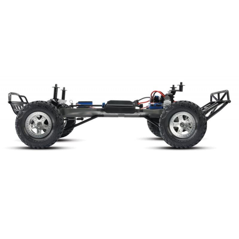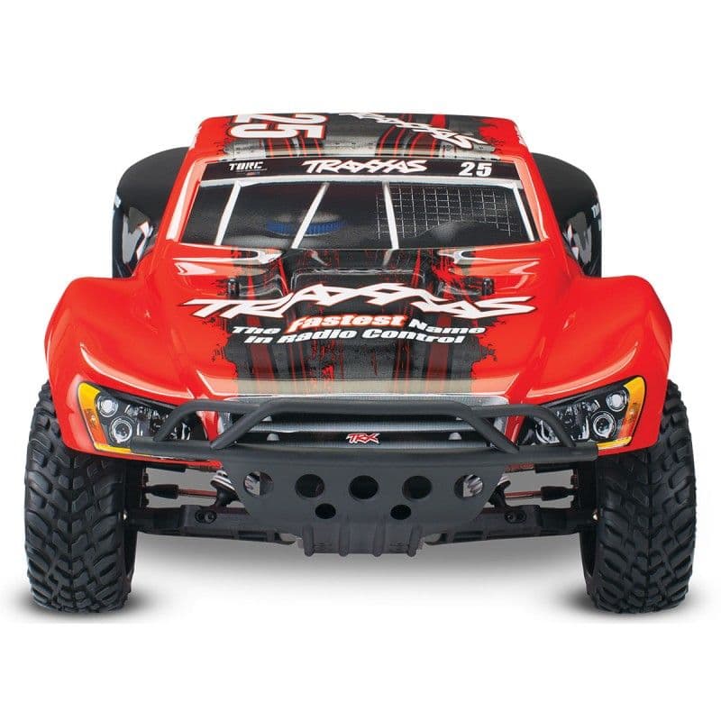 The Traxxas Slash Short-Course Race Truck puts you in the driver's seat for intense fender-to-fender, high-flying off-road action. The full-scale Short-Course Race Trucks embody the spirit of Traxxas R/C with their extreme 900+ horsepower racing engines full-throttle, dirt-roosting power slides, giant suspension travel, and Supercross-style big-air jumps. The Traxxas Slash brings all the action home so you can experience the high-speed head-to-head competition at the track or in your own backyard. The Slash was inspired by the TORC™ (THE Traxxas Off-Road Championship™) Pro 2WD class. The Pro 2WD class specifies rear-wheel drive trucks purpose built to fly over jumps and rip full-throttle through the turns. The Traxxas Slash hangs it out for an all new way to challenge your driving skills. The 4-wheel independent suspension has been carefully tuned to replicate the Pro 2 driving and handling experience as closely as possible. The scale appearing tires provide just the right amount of bite and thick, blinding clouds of dirt roost.