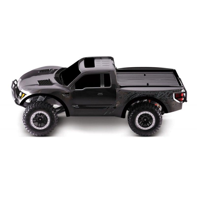 Fast, powerful, and tough, the Ford F-150 SVT Raptor is now available as a high-performance Ready-To-Race® replica model exclusively from Traxxas. Based on the award-winning Traxxas Slash and molded in black for a tough look, the Ford Raptor model features waterproof electronics for all-weather off-road adventure, rugged independent suspension with long-travel oil-filled shocks, and a powerful Titan 550 motor that delivers 30+mph top speeds. Rubber-sealed ball bearings, heavy-duty steel transmission gears, and high-strength materials assure your Raptor model is "Built Ford Tough" for exciting R/C performance run after run.