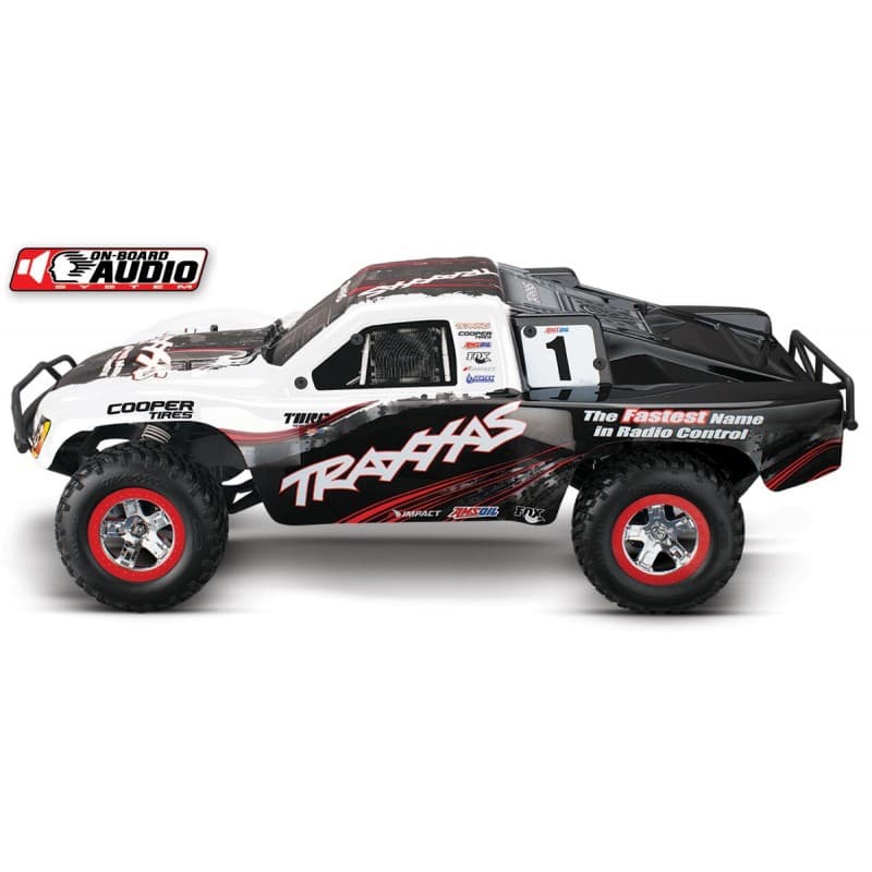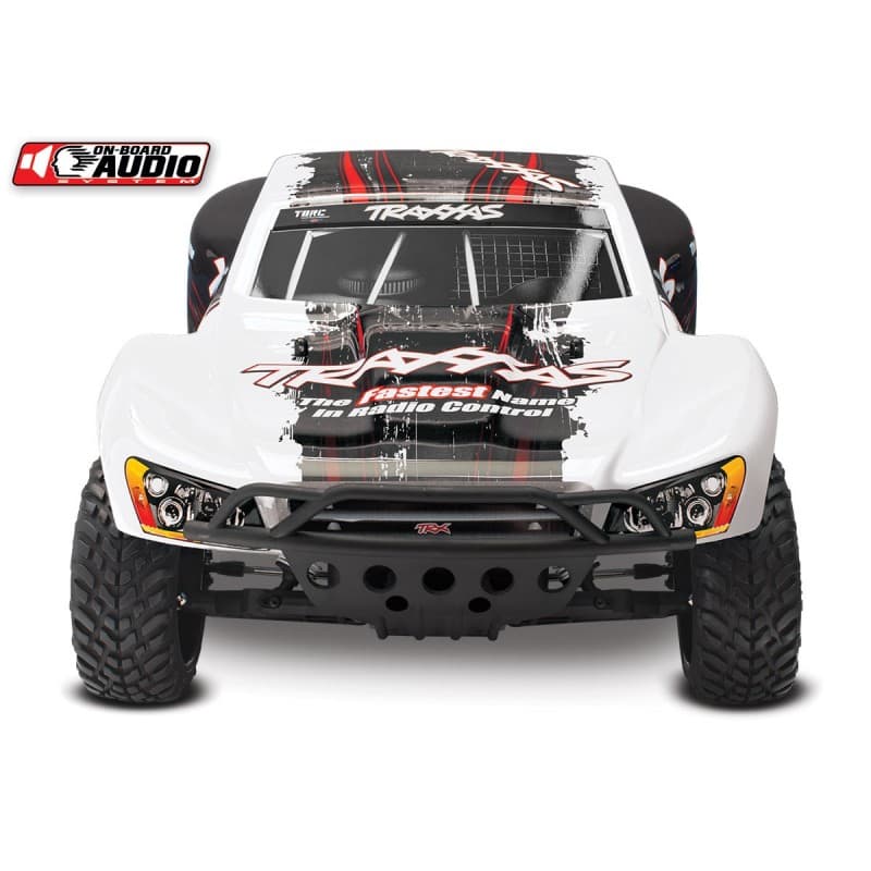 Grab the throttle and the On-Board Audio System roars to life, projecting the actual engine sounds from a 900+ horsepower Pro 4X4 short course truck. Prepare to experience the beat of every piston stroke, feel the gear shifts under acceleration, and hear the horsepower as the RPM's scream through the power band. Bash it, crash it, and get it wet. No need to hold back...the sound system is just as rugged as the Slash itself. Flip the rocker switch on the supplied 3-channel TQ 2.4 GHz transmitter to put the truck in neutral to rev up the engine. The precision audio and throttle response connects you to the truck for a whole new driving experience. Traxxas On-Board Audio is the exciting new dimension in Radio Controlled fun!