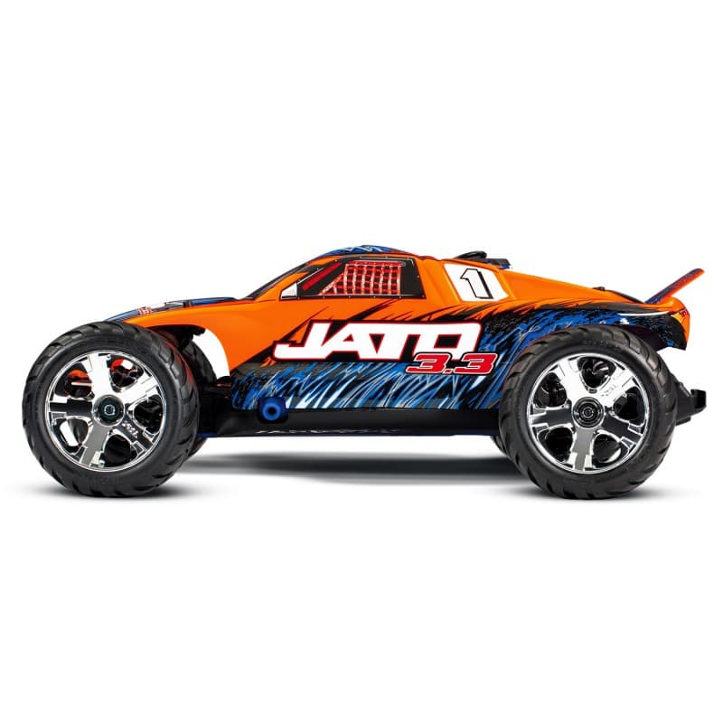 It's the only way to describe it. Combine the extreme power of the TRX® 3.3 Racing Engine with the incredible Traxxas Jato® and the results will leave you speechless. Stunning, jaw-dropping acceleration and face-distorting top speed propel Jato performance into the stratosphere. It's a power packed combination for excitement we couldn't resist. Bury the throttle and 60mph flies by in a mere 4.2 seconds. Top speed is over 65mph! 2nd gear wheelies? You bet! The integrated wheelie bar is included!