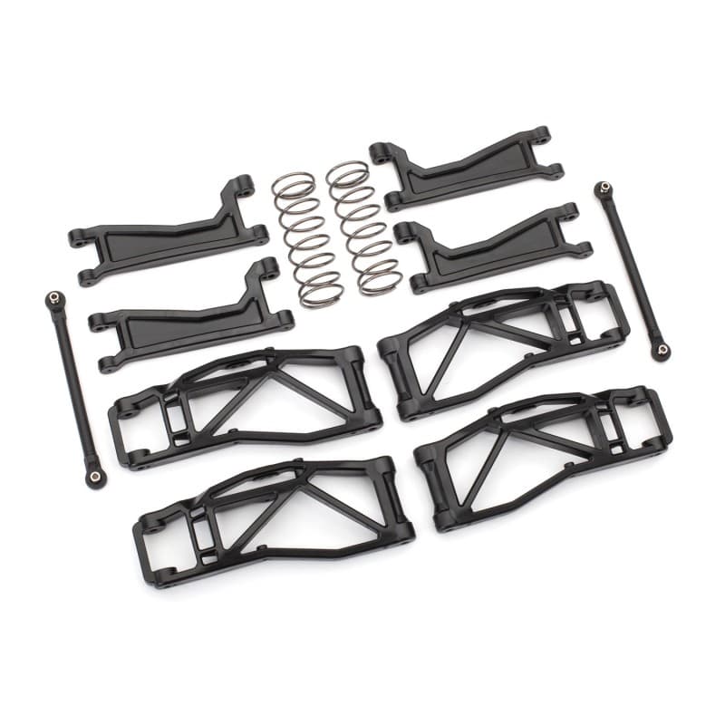 The WideMaxx kit consists of extended versions of the Maxx’s extreme-duty cold-weather suspension arms, available in 6 total colors to allow you to customize your truck to your style. Additionally, new springs are included for the rear of the truck to dial in the suspension settings, while the original rear springs move to the front for optimum balance and performance. Finally, a set of wider toe links for the front and extended driveshafts for all four wheels finish out the new widened stance.