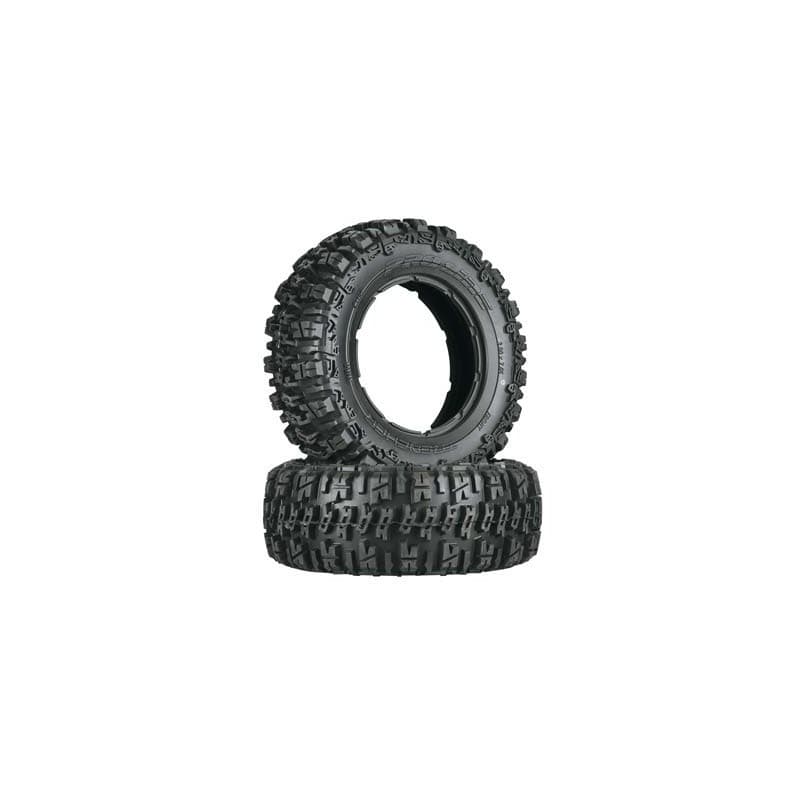 Leave a mark with your 5T wherever you are with Pro-Line's Trencher tires. The Trencher tires are designed to give your 5T optimal traction on just about any surface. Super cool horizontal H shaped treads give your 5T ridiculous amounts of forward bite. And tread height and ¼” tall, you'll find that durability and longevity are second to none.