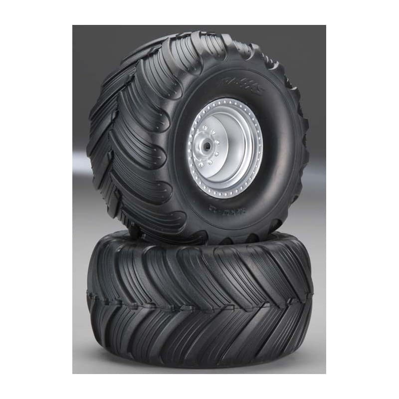 These are the Satin Chrome, Dual Profile Rear Wheels with Monster Jam Replica Tires.