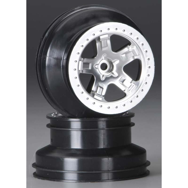 These are the Rear Satin Chrome Wheels for the 2WD Traxxas Slash Short Course Racing Truck RTR.