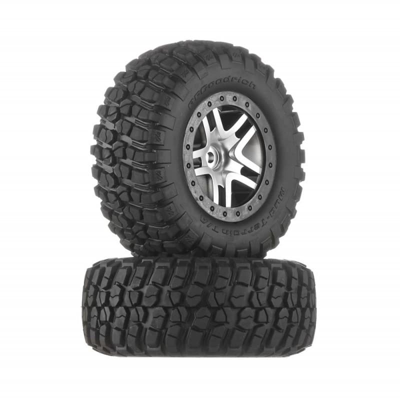This is a pair of Traxxas B.F. Goodrich Mud Terrain T/A KM2 Tires Pre-Mounted on SCT Wheels.