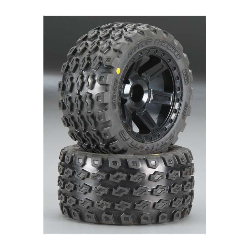 This is a pair of Pro-Line Dirt Hawg 2.8" (Traxxas Style Bead) Tires Mounted on Desperado Black Front Wheels for JATO, Nitro Stampede/Rustler. The Dirt Hawg 2.8" is THE tire of choice for all of your Traxxas Rustler and JATO bashing needs. Making your truck the toughest looking one on the block has never been easier now with the Dirt Hawg tires premounted to the Desperado wheels.