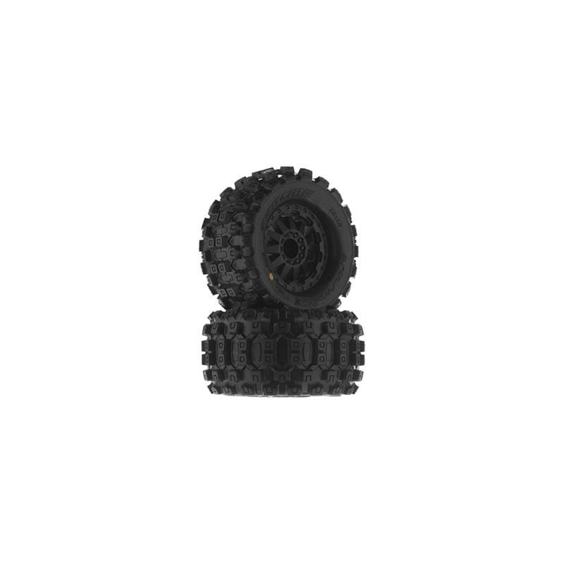 This is a Pre-Mounted 2.8” Badlands MX28 Tire. Pro-Line is taking the 2.8” tire game to the next level with the Biggest and Baddest tire ever conceived: the Badlands MX28! Pro-Line Badlands tires are known for having sweet Motocross inspired tread and the all-new Badlands MX28 tires kick that up a notch with a Bigger and Bolder knobby tread that matches modern MX tire design. The Badlands MX28 is a true All-Terrain tire that will find traction on any surface but is best suited for loose & loamy dirt, mud or grass. Just imagine your truck throwing up huge rooster tails with these awesome looking tires! Compared to the previous Pro-Line Badlands tires, you can expect even better traction, improved wear resistance and enhanced style. Be the first on your block to get the all-new Badlands MX28 tires - Order yours today!