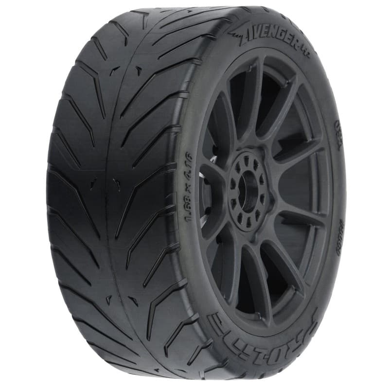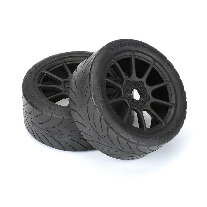 The Avenger HP tires are pre-mounted on Mach 10 Black Wheels so you don't have to worry about gluing your own tires or waiting for them to dry. The Mach 10 features 10 aggressive spokes that will make your buggy look fast even sitting still. The Mach 10 wheels have a 17mm hex and are made from a single molded piece of high-quality Nylon proudly produced by Pro-Line in the USA! Get maximum grip and stability so you can be faster than your buddies with Pro-Line's all-new Avenger HP BELTED 1:8 Buggy street tires!