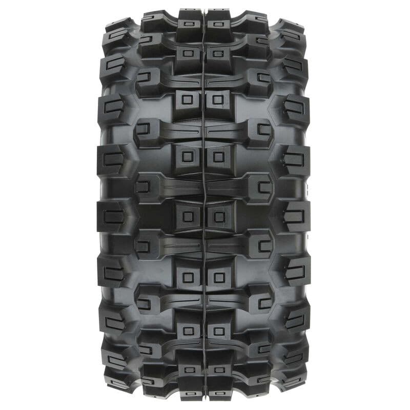 Pro-Line is taking the 3.8" tire game to the next level with the Baddest tire ever conceived: the Badlands MX38 HP BELTED tires! Pro-Line Badlands tires are known for having a sweet Motocross inspired tread and the all-new Badlands MX38 HP tires kick that up a notch with Bigger and Bolder knobby tread. The Badlands MX38 is a true All-Terrain tire that will find traction on any surface but is best suited for loose & loamy dirt, mud or grass. Just imagine your truck throwing up huge rooster tails with these awesome looking tires!
