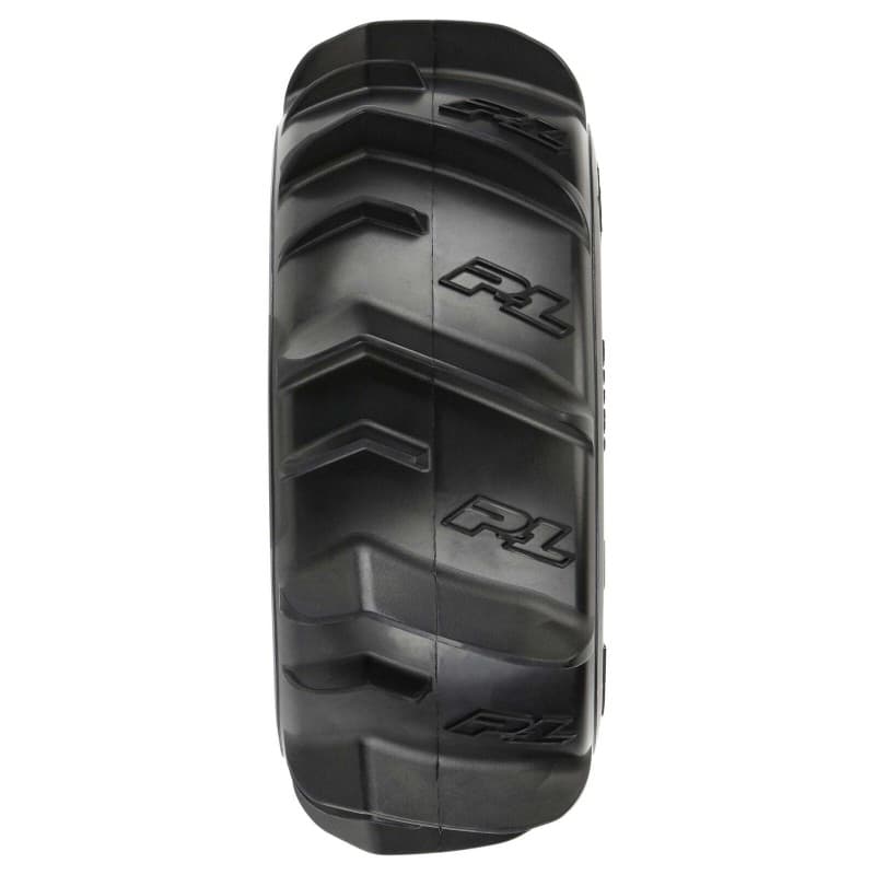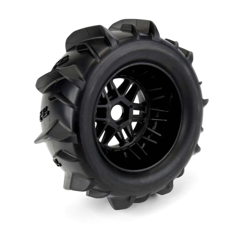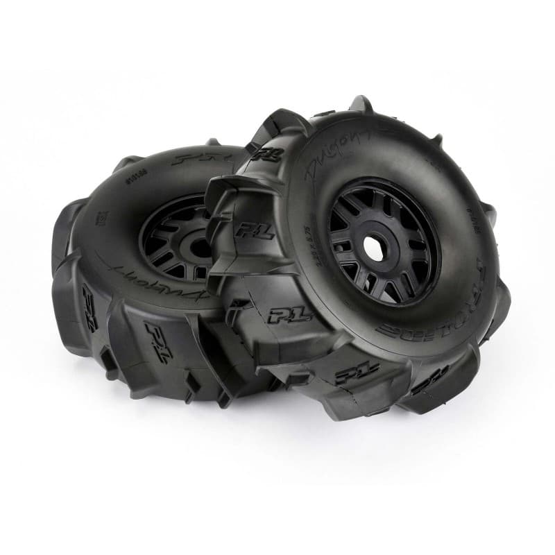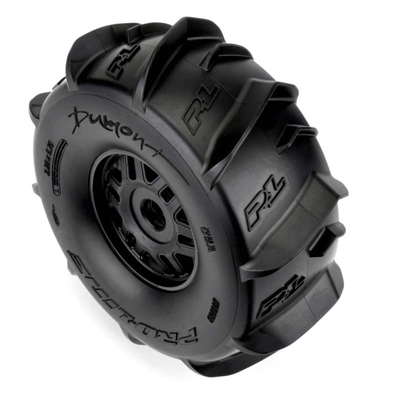 The Dumont Paddle tire uses the latest in paddle tread technology with large offset V-shaped paddles for maximum roosting power. Pro-Line P-L logos have been embedded into the tire carcass giving it the style that you have come to expect from Pro-Line. The Dumont Paddle tire gets its name from the incredible Dumont Sand Dunes in California, but these paddle tires are equally at home shredding your local snowfield in the winter. The Dumont Paddle tires are mounted to a pair of stock "Split Six" style Black ARRMA® Mojave™ wheels so you know they will fit and perform exceptionally well. We take the guesswork out of your glue job by doing the mounting for you so you can spend your time having fun! Don't get stuck spinning your tires in the sand or snow. Get a set of pre-mounted Dumont Paddle tires for your ARRMA® Mojave™ today!