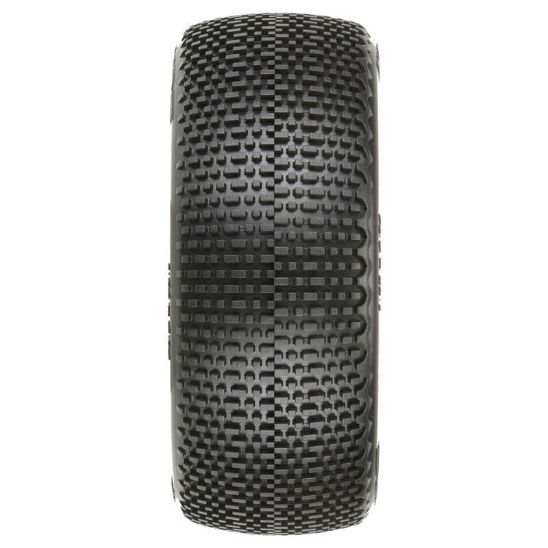 This is a pair of pre-mounted Buck Shot 1:8 Buggy Race Tires. The Buck Shot debuted at the 2017 ROAR National Championships and is already a Winner at the hands Pro-Line Team Driver Ty Tessmann! The Buck Shot has pins that are very close in size to the amazing Hole Shot 2.0 but the Buck Shot pins are stacked closer together side to side, which provides significantly longer-lasting performance. Unique to the Buck Shot are the alternating elongated bars that provide incredible forward grip! Similar to the extremely popular SwitchBlade tire, the Buck Shot is a directional tire with a different tread on the outside compared to the inside, allowing you to mount the tires in the direction that suits your current track conditions. One side of the tire has standard pins, which is ideal for loose or low traction conditions where you want the tire to add side grip and improve steering. When you mount the tire in the other direction, the connected side tread (Blade) reduces side traction in high-bite or edgy conditions. Racers who have tried the Buck Shot are saying that it is their new favorite tire!