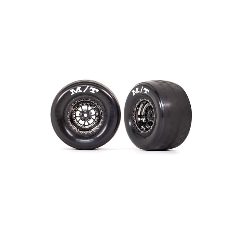 Wide Mickey Thompson drag slicks come pre-glued to black chrome Weld wheels to replicate the legendary look and performance of the real thing. Developed with extensive testing, the slicks’ unique compound is formulated to balance long tire life with maximum traction.