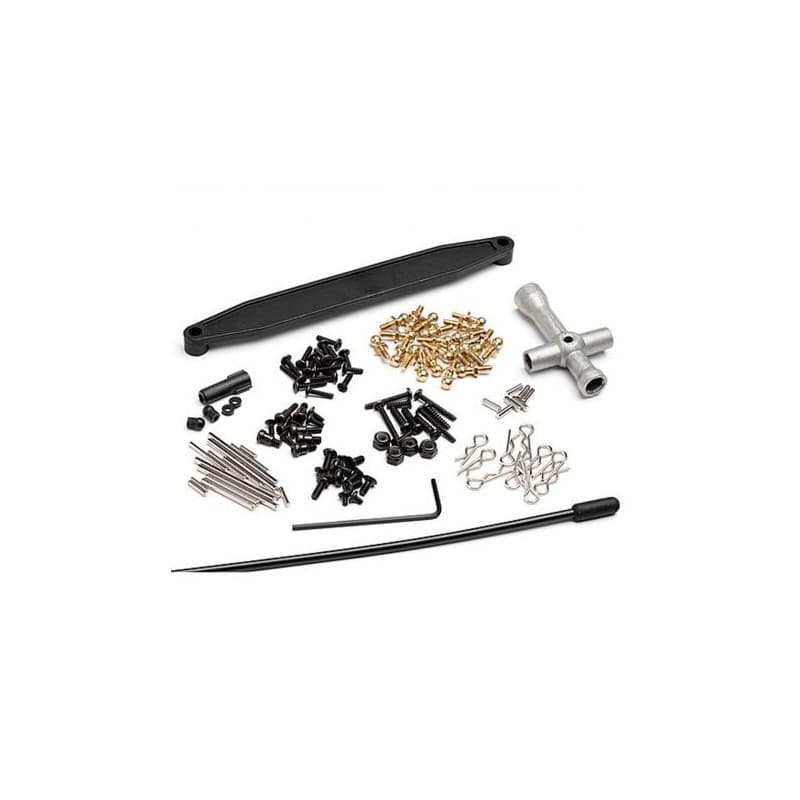 This is a replacement HPI Recon Hardware & Tool Set. This package includes a replacement battery strap, ball studs, body clips, hinge pins and various hardware.