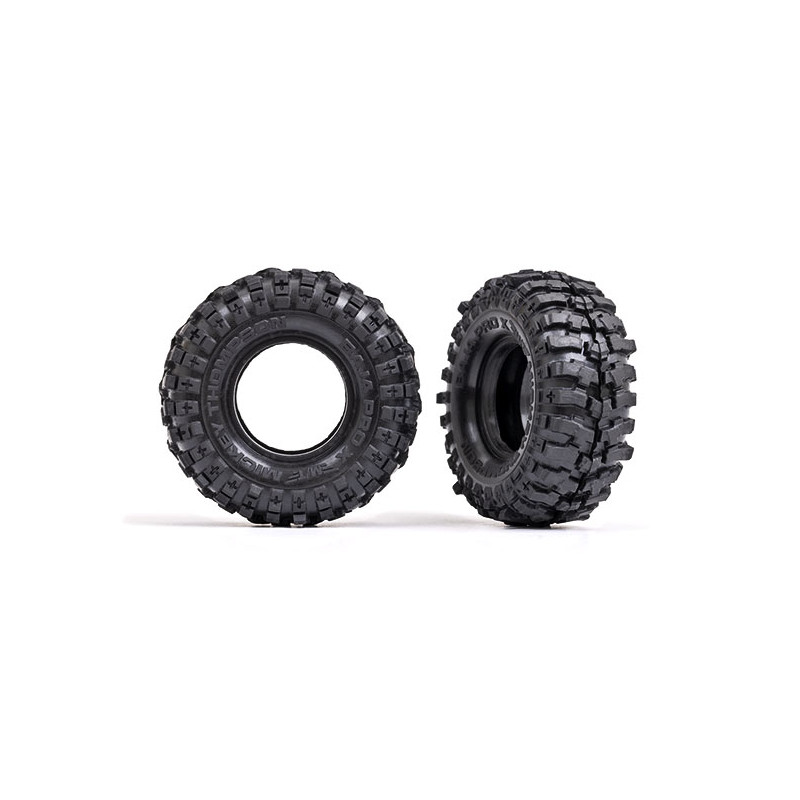 Aggressive side lugs and deep channels give these 1/18 scale 2.2" Mickey Thompson® Baja Pro X® tires nearly unstoppable traction on any surface. The soft-compound rubber grips onto rock surfaces to carry your TRX-4M™ up and over obstacles. Mount them on your stock 1.0" TRX-4M wheels or optional 9781 beadlock wheels. Sold as a pair.