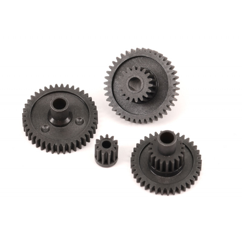 Designed for all-around action, the high-range gear set is a direct replacement for stock TRX-4M™ transmission gears. The package includes a full set of transmission gears and an 11-tooth pinion gear with a total 16.6:1 reduction ratio.