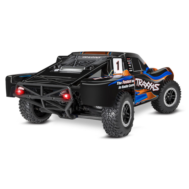 The Traxxas Slash set the standard for durability, performance, and fun by which all other short course trucks are measured. Outfitted with the powerful Titan 12T 550 motor and bulletproof reliability of the XL-5 electronic speed control, the Slash takes on any high-flying, fender-banging, adventure you can throw at it. Waterproof electronics keep the fun going through wet weather conditions and LED lighting extends your driving fun after dark. Grab your transmitter, rip some 4-wheel roost, and discover why nothing else is built like a Slash!