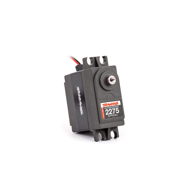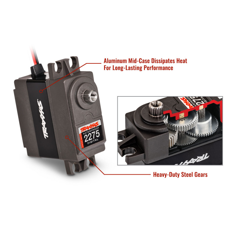 The ultra-high-torque 2275 digital ball bearing servo provides precise control and maximum torque in a standard-size servo footprint. A fully-waterproof case allows worry-free driving in water, mud, and snow with an aluminum mid section for improved strength and heat dissipation. The 2275 servo offers a significant performance upgrade over standard 2075-series servos with the outstanding durability of all-metal gears and 347 oz-in of torque.